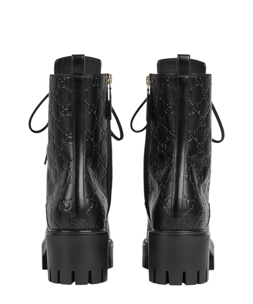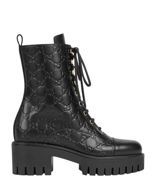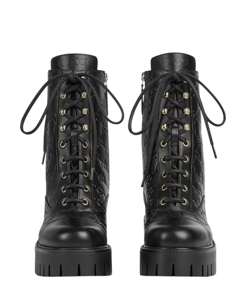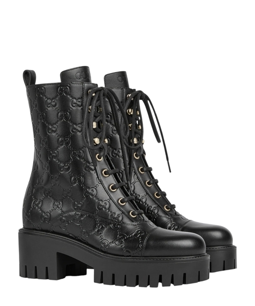 Ботильоны на шнуровке с логотипом GG от Gucci — это смелое сочетание комфорта и выразительного стиля. Модель выполнена из гладкой чёрной кожи с тиснением фирменного монограмного узора GG, что придаёт ей современный и узнаваемый характер. Контрастная шнуровка и золотистая фурнитура подчёркивают стильный акцент, а массивная подошва с глубоким протектором обеспечивает устойчивость и комфорт при ходьбе. Эти ботильоны идеально подойдут как для городского образа, так и для кэжуал-комбинаций с платьями, брюками или джинсами.